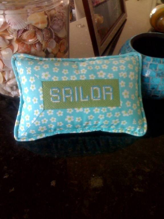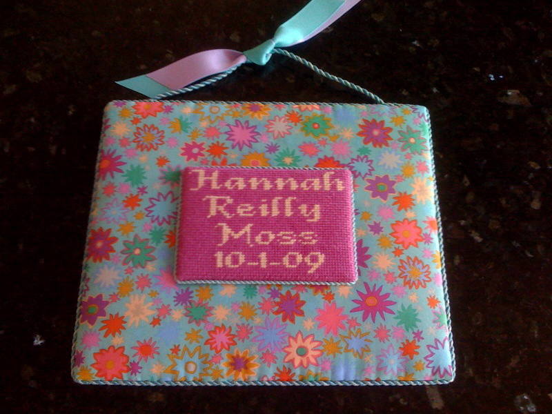 | HOW TO ORDER--- Email me the name and date of the special occasion- birth, anniversary, graduation. If you have a preference for fabrics, color or style, please mention. I will send you a photo of some of the fabrics currently in stock for your selection. Then we will confirm the text. You may suggest colors for needlepoint but that is largely determined by fabric chosen. |
